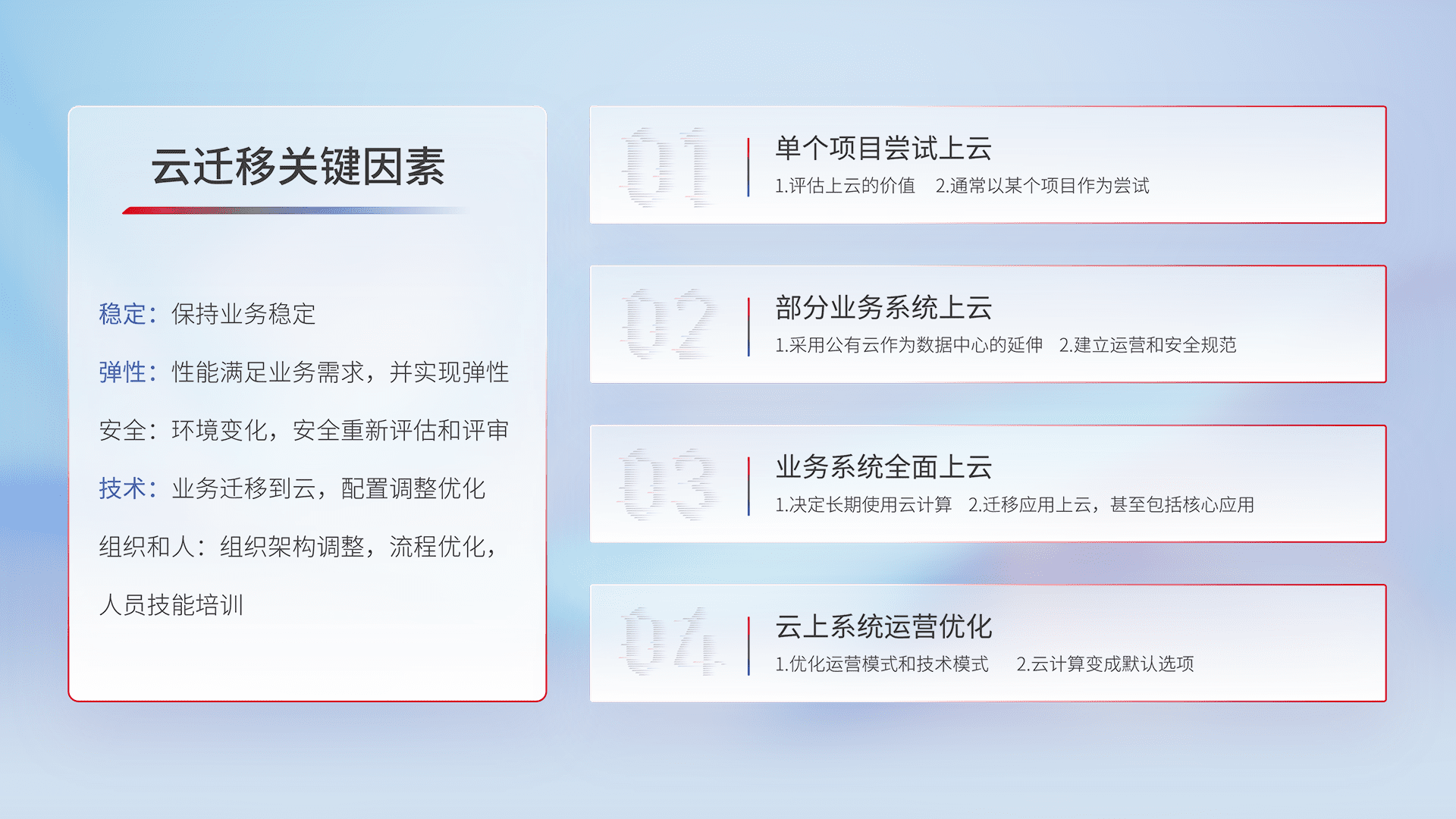结合实际业务,,,从规划设计、、云平台选型、、云原生改造、、、、数据迁移、、、、集成交付,,,,迁移全过程为客户识别最佳上云路径,,,做好风险识别管理,,,设计网络架构、、身份权限、、、安全审计合规、、、操作审计、、、日志审计、、监控告警策略、、、、多站点容灾设计等,,,,对云上基础设施进行整体规划,,,,提升IT治理水平,,,以满足弹性、、、高可用、、、高性能的需求。。。