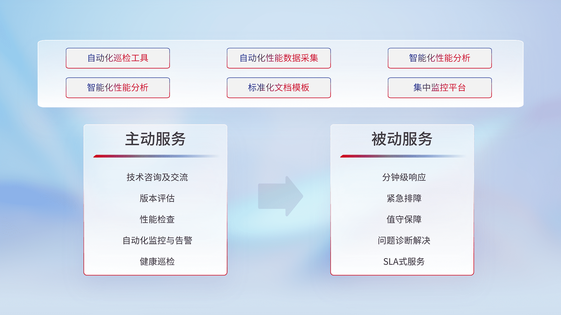 智能化工具和标准化文档,,,保障服务质量,,,,提供主动服务(包含技术咨询、、版本评估、、性能检查、、自动化监控与告警、、健康巡检)和被动服务包含(分钟级响应、、、、紧急排障、、、值守保障、、问题诊断解决、、、、SLA服务)。。。。